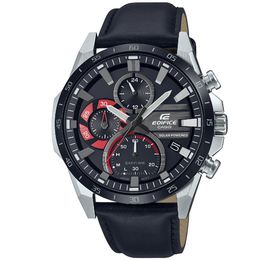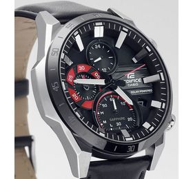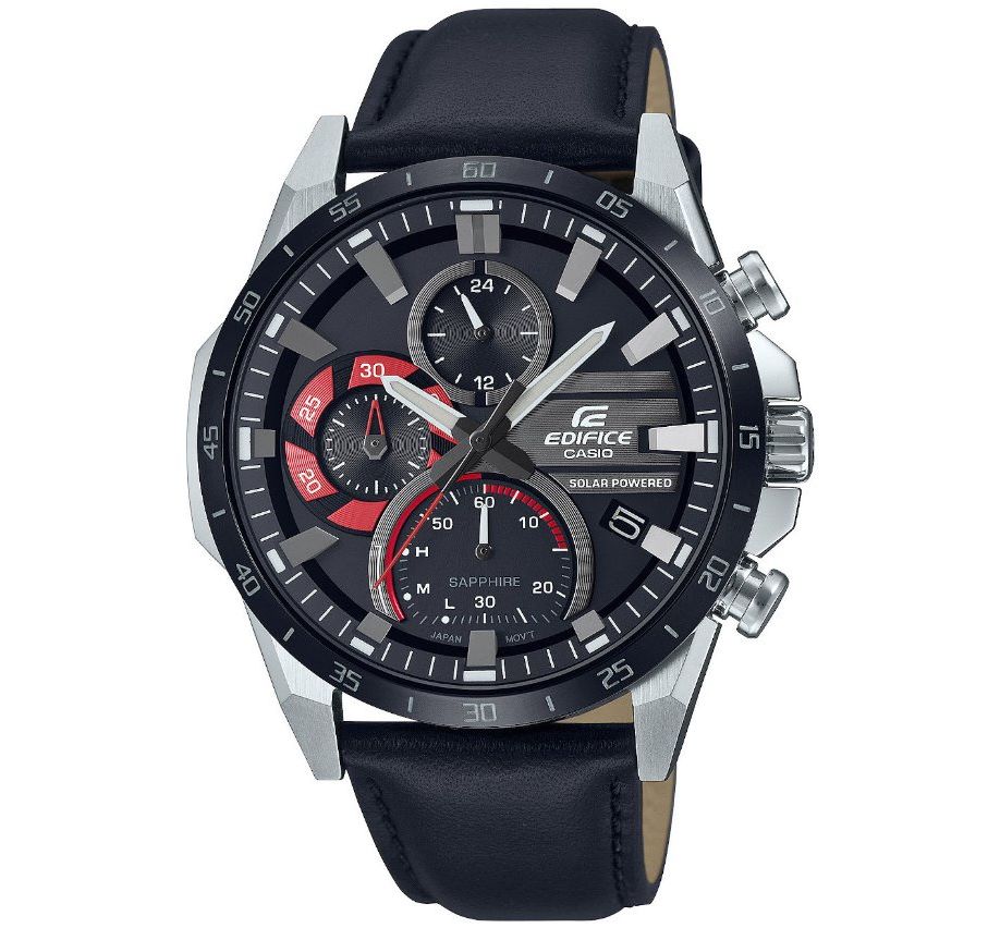 Edifice Collection EDIFIСE премиальная линейка японских часов Casio. Стильный многофункциональный аксесуар, сочетающейся практически с любым гардеробом. Часы идеально подходят для активных людей чия жизнь не стоит на месте. Соответствуют новому взгляду на часы. Имеют большой диаметр, что хорошо смотрится при современном размере циферблатов. Корпус из нержавеющей стали, имеет износоустойчивое IP покрытие. Ремешок кожаный. Задняя крышка закручивается на резьбе. Три элемента управления справа, две кнопки и одна коронка. Стекло сапфир, устойчиво к царапинам. Циферблат многослойный, объемный. На стрелках и метках нанесено светонакопительное покрытие. Стрелки крупные, в виде мечей, отлично видны ночью. Элемент питания заряжается от любого источника света. Часы могут работать без подзарядки пять месяцев, в энэргозберегающем режиме девятнадцать месяцев. У отметки четыри часа, окошко для отображения даты. Дополнительные маленькие циферблаты участвуют в роботе секундомера (хронографа). Хронограф активируется нажатием верхней правой кнопкой. Нижний циферблат начинает отсчитывать секунды. При достижении полного круга, будит отображаться отсчет минут на левом верхнем циферблате. Хронограф останавливается правой верхней, сбрасывается правой нижней кнопкой. У коронки два положения. В первом настраивается число, во втором часовой и минутной стрелкой время. Водонепроницаемость 100 метров. В них можно не только мыть руки, но и плавать. Официальная гарантия 2 года.
