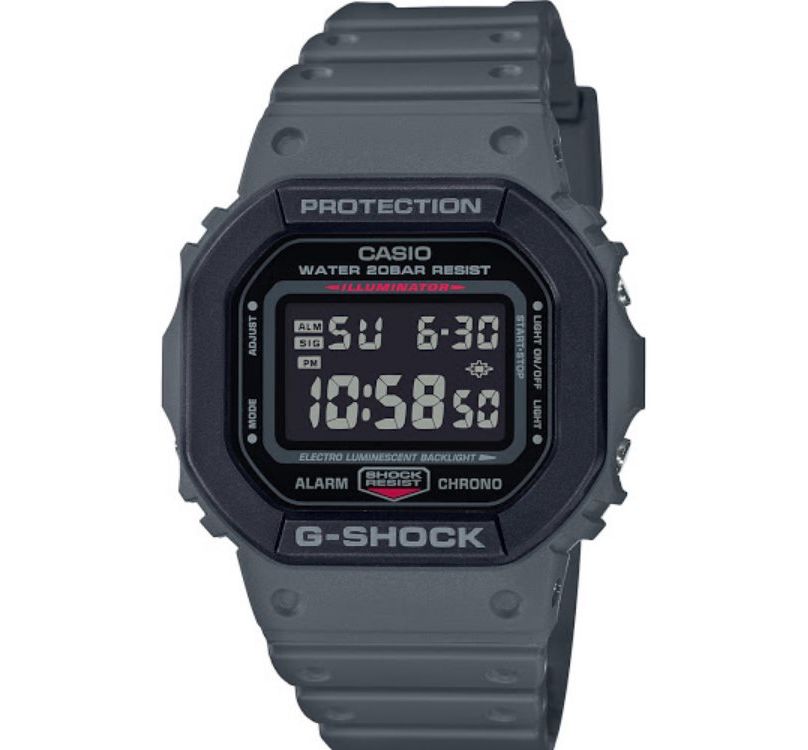 CASIO DW-5610SU-8ER с традиционным квадратным корпусом, и специальной конструкцией что дополнительно защищает кварцевый механизм от ударов и вибраций. Модель исполнена в сером цвете корпуса и ремешка, с черным безелем и дисплеем — сочетание этих оттенков придает крутой милитари стиль, с нотками городской моды.
