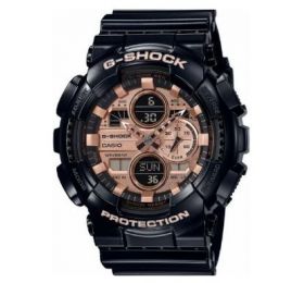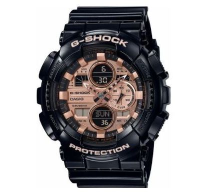 G-SHOK SERIES Противоударные, многофункциональные часы. Идеально подходят для занятия спортом. Имеют невероятную водонепроницаемость до 200 метров. Отлично послужат модным и стильным аксессуаром для современного человека. Ремешок и корпус сделан из полимерных материалов. Застежка и задняя крышка из нержавеющей стали. Прочное минеральное стекло надежно защищает часы от повреждений. Большие кнопки утоплены в корпус по две с каждой стороны, имеют ребристую текстуру для легкости управления. Стрелки с острыми наконечниками, которые точно попадают в деления. Это позволяет быстро определить время. Два цифровых дисплея показывают время в цифровом формате либо число, месяц, день недели и отсчет секунд, на выбор. Еще можно включать секундомер до 100 часов, таймер обратного отсчета до 24 часов, менять часовые пояса, пользоваться пятью будильниками. Подсветка светодиодная, автоматически активируется при повороте часов на себя или кнопкой. Элемента питания хватает от 2 до 5 лет. Размер 55 мм на 52 мм, толщина 17 мм. Оснащены вечным календарем. Часы можно заказать с другим ремешком и расцветкой циферблата. Для этого в строке поиска нужно ввести название модели без окончания, GA-140