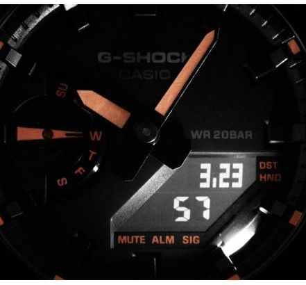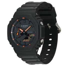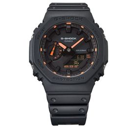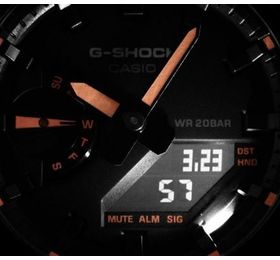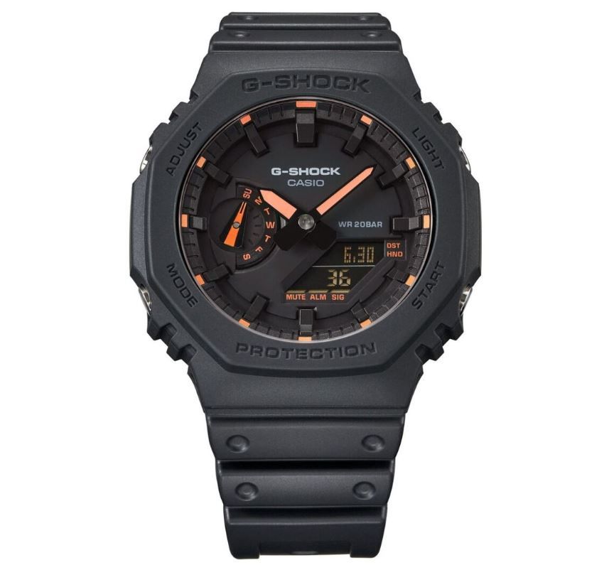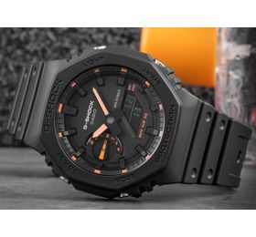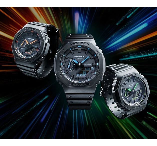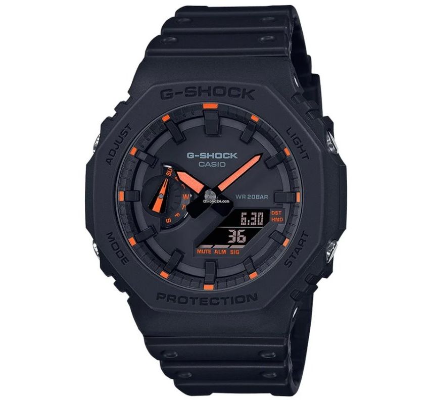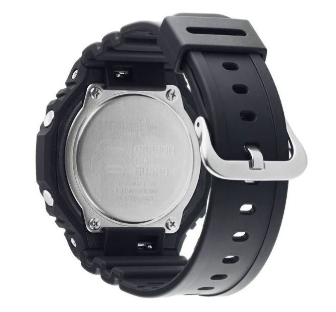 Новинка в серии G-SHOCK. Ультратонкие, компактные, многофункциональные, противоударные часы. Идеально подходят для занятия спортом. Имеют невероятную водонепроницаемость до 200 метров. Отлично послужат модным и стильным аксессуаром для современного человека. Новый дизайн корпуса в виде шестиугольника выполнен из углеволокна, современного материала, невероятно легкого и очень прочного известного как Carbon Core Guard, покрыт полимерным кожухом. Ремешок быстросъемный полимерный с подпружиненным затвором. Стекло закаленное минеральное устойчивое к ударам. Циферблат объемный с цифровым дисплеем. На нем отображается время в цифровом формате либо число, месяц и отсчет секунд на выбор. На девяти часах находится полукруг, на который нанесены аббревиатуры дней недели. Функционал часов: пять независимых будильников, таймер обратного отсчета на 24 часа, секундомер на 24 часа и мировое время с изменением часовых поясов. Крупные белые стрелки, в форме мечей, с мощным светонакопительным покрытием. Подсветка мощная светодиодная с эффектом послесвечения. Элемента питания хватает от 3 до 8 лет. Размер 48 мм на 45 мм, толщина 12 мм. Оснащены вечным календарем. Часы можно заказать с другим ремешком и расцветкой циферблата. Для этого в строке поиска нужно ввести название модели без окончания, GA-2100