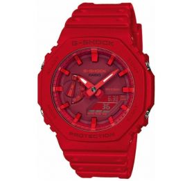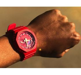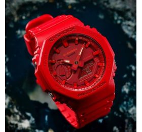 Новика в серии G-SHOK. Ультратонкие, компактные, многофункциональные, противоударные часы. Идеально подходят для занятия спортом. Имеют невероятную водонепроницаемость до 200 метров. Отлично послужат модным и стильным аксессуаром для современного человека. Новый дизайн корпуса в виде шестиугольника выполнен из углеволокна, современного материала, невероятно легкого и очень прочного известного как Carbon Core Guard, покрыт полимерным кожухом. Ремешок быстросъемный полимерный с подпружиненным затвором. Стекло закаленное минеральное устойчивое к царапинам. Циферблат объемный с цифровым дисплеем. На нем отображается время в цифровом формате либо число, месяц и отсчет секунд на выбор. На девяти часах находится полукруг, на который нанесены аббревиатуры дней недели. Функционал часов: пять независимых будильников, таймер обратного отсчета на 24 часа, секундомер на 24 часа и мировое время с изменением часовых поясов. Крупные белые стрелки, в форме мечей, с мощным светонакопительным покрытием. Подсветка мощная светодиодная с эффектом послесвечения. Элемента питания хватает от 3 до 8 лет. Размер 48 мм на 45 мм, толщина 12 мм. Оснащены вечным календарем. Часы можно заказать с другим ремешком и расцветкой циферблата. Для этого в строке поиска нужно ввести название модели без окончания, GA-2100