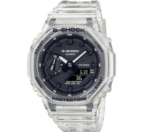 Стильные и тонкие часы CASIO GA-2100SKE-7AER приятно удивят вас, своим дизайном и своим высоким качеством. Все мы привыкли что часы серий G-SHOCK в основном обладают массивным корпусом, но... Данная модель часов сохранила абсолютно все уникальные свойства всеми любимым нам спортивным часам, и поместила всё это в тонкий и очень аккуратный корпус. Ударопрочная конструкция и усиленный углеродными волокнами карбоновый корпус создают надежную защиту механизму. Прозрачный полимерный материал ремешка и браслета создают впечатление невесомости, но вопреки этому они довольно прочные и надежные. Минеральное стекло с высокой устойчивостью к царапинам и ударам. Для подсветки используется специальный светодиод, а также на стрелки часов нанесено специальное неоновое покрытие. Доступен такой набор функций: секундомер измерят пределы прошедшего времени до 24 часа; таймер обратного отсчета с возможностью автоматического отсчета установленного времени, пределы предварительной установки времени от 1 секунды до 24 часа; отображение мирового времени; 5 будильников для ежедневного использованья; перемещение стрелок легким нажатием кнопки для быстрого доступа к цифровому дисплею, календарь после правильной настройки будет всегда показывать точное число; отображение цифрового времени в комфортном вам формате на 12/24 часа. Кварцевый механизм питается от батарейки со средним сроком службы в три года.