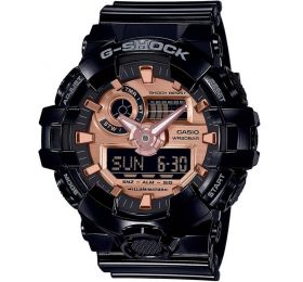G-SHOK SERIES Противоударные, многофункциональные часы. Идеально подходят для занятия спортом. Имеют невероятную водонепроницаемость до 200 метров. Отлично послужат модным и стильным аксессуаром для современного человека. Ремешок и корпус, сделан из полимерных материалов. Застежка стальная. Прочное минеральное стекло надежно защищает часы от повреждений. Большие кнопки утоплены в корпус по две с каждой стороны, кнопка подсветки расположена на шести часах. Подсветка светодиодная. Стрелки с черной окантовкой. Циферблат объемный с цифровым дисплеем, на нем отображается день недели, число и месяц либо отсчет секунд и время в цифровом формате. На десяти часах расположено колесо выбора функций, индикатором отмечаются функции которые выбраны на данный момент. Секундомер до 100 часов, таймер обратного отсчета до 1 часа, будильник, Смена часовых поясов. Размер 57 мм на 53 мм, толщина 18 мм. Батарейки хватает на 5 лет. Оснащены вечным календарем. Часы можно заказать с другим ремешком и расцветкой циферблата. Для этого в строке поиска нужно ввести название модели без окончания, GA- 700