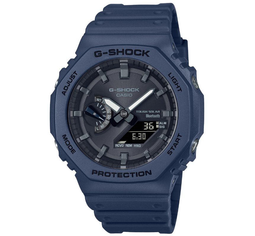 G-SHOCK NEW SERIES Ультратонкие, компактные, многофункциональные, противоударные часы. Идеально подходят для занятия спортом. Обладают невероятной водонепроницаемостью до 200 метров. Отлично послужат модным и стильным аксессуаром для современного человека. Новый дизайн корпуса в виде шестиугольника выполнен из углеволокна, современного материала, невероятно легкого и крепкого, известного как Carbon Core Guard, покрытый полимерной накладкой. Ремешок быстросъемный с затвором. Стекло закаленное минеральное устойчиво к царапинам. Циферблат объемный с цифровым дисплеем. На нем отображается время в цифровом формате или число, месяц и отсчет секунд по выбору. Функционал часов: пять независимых будильников, таймер обратного отсчета, секундомер и мировое время с изменением часовых поясов. Большие белые стрелки в форме мечей с мощным светонакоплением. Подсветка мощная светодиодная.Элемент питания заряжается от любого источника света. Часы могут работать без подзарядки пять месяцев, в энэргозберегающем режиме девятнадцать месяцев. Оснащены вечным календарем. Часы можно заказать с другим ремешком и окраской циферблата. Для этого в строке поиска нужно ввести название модели без окончания, GA-B2100