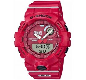 G-SHOCK EVERLAST SERIES Limited Edition Создны в колоборации с всемирно известным брендом по производству экиперовки для бокса и единоборств Everlast. Логотипом украшен циферблат и ремешок. Противоударные, многофункциональные часы. Идеальный аксессуар для активных людей чия жизнь не стоит на месте. А фитнес и мода стали неотъемлемой ее частью. С помощью Bluetooth вы можете подключить часы к смартфону и получить доступ к целому ряду полезных функций через приложение G-Shock Connected. Настройка времени, отслеживают места активности на карте, считают потраченные калории. Считывают ежедневную активность и приводят статистику, выводя ее на смартфон. В часах есть шагомер и трекер активности. Основная особенность трехосный датчик, который довольно хорошо отслеживает шаги, понимает когда вы бежите, а когда просто прогуливаетесь. Секундомер на 24 часа, с возможностью сохранения данных, таймер, пять будильников, мировое время, смена часовых поясов, функция поиска телефона, при нажатии кнопки на часах смартфон подает звуковой сигнал. Подсветка LED, автоматически активируется при повороте часов на себя или кнопкой. Циферблат объемный с цифровым дисплеем. На нем отображается время в цифровом формате либо число, месяц и отсчет секунд на выбор. Нажатием кнопок активируется на дисплей шагомер. Крупные белые стрелки, в форме мечей, с мощным светонакопительным покрытием. Стекло противоударное минеральное. Корпус и ремешок из полимера. Календарь автоматически настраивается по Bluetooth. Элемента питания хватает от 2 до 5 лет. Размер 54 мм на 48 мм, толщина 15 мм. Водонепроницаемость 200 метров. Часы можно заказать с другим ремешком и расцветкой циферблата. Для этого в строке поиска нужно ввести название модели без окончания, GBA-800