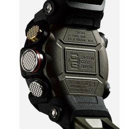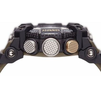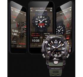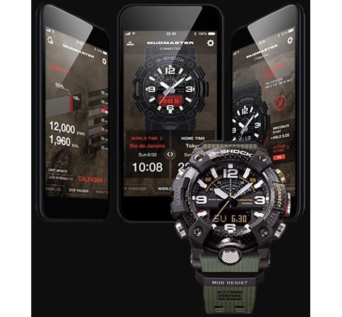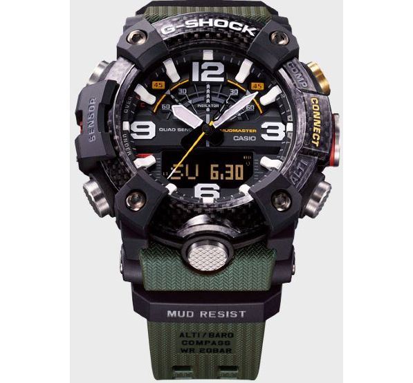 G-SHOCK NEW MUDMASTER Противоударные, многофункциональные часы. Отличный аксессуар и шикарный подарок всем любителям экстремальных видов спорта и отдыха. Олицетворяют сочетания функций, необходимость в которых может возникнуть в различных экстремальных и нестандартных ситуациях, так и ежедневных, которыми пользуются регулярно. С помощью кнопки Connect, вы можете подключить часы к смартфону по Bluetooth и получить доступ к целому ряду полезных функций через приложение G-Shock Connected. Шагомер, счетчик шагов. Индикатор местоположения, указывает направление и расстояние до ранее сохраненного местоположения на часах. Запись высот и пройденного маршрута. Количество сожженных калорий за день. Переключение часовых поясов с перенастройкой на столицы других стран. Корпус выполнен из многокомпозитных современных материалов, невероятно легкого и очень прочного известного как Carbon Core Guard, углепластика и прозрачного полимера. С повышенной грязезащитой. Стекло противоударное минеральное. Крупные белые стрелки, в форме мечей, с мощным светонакопительным покрытием. Циферблат объемный с цифровым дисплеем. На нем отображается время в цифровом формате либо число, месяц и день недели на выбор. Нажатием кнопок, на циферблате активируется: Барометр от 260 до 1100 hPa, с барометрическим графиком. Альтиметр, высотомер до 10000 метров и графиком набора высоты, со значением метража над уровнем моря. Термометр от -10°C до +60°C. Steptracker шагомер, Данные о восходе и закате солнца. Секундомер на 24 часа. Таймер обратного отсчета до 24 часов. Пять независимых будильников. Функция перемещения стрелок. Функция поиска телефона. Автоматический календарь. Индикатор низкого уровня заряда аккумулятора. В часах есть автоматическая светодиодная подсветка. Размер 55 мм на 53 мм, толщина 19 мм. Водонепроницаемость 200 метров.