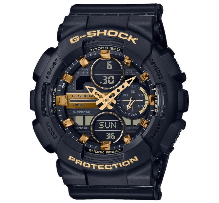 CASIO GMA-S140M-1AER это часы с перспективой и гибким дизайном. Если вы активный, уверенный, и сильный - присмотритесь к данной модели. Может именно ее вы искали всё это время? Ударопрочная конструкция и повышенная устойчивость к вибрациям, делают эту модель по-настоящему выносливой, при любых условиях. Дизайн прекрасно сочетает в себе черный и золотой цвет. Светодиодная подсветка имеет функцию автоматического включения, идеальный выбор если вам надо следить за временем когда руки заняты. Прочное минеральное стекло защищает ЖК дисплей. Корпус из полимерного пластика довольно прочный и легкий, и переносит более легко перепады в температуры в окружении. Ремешок из полимерного пластика идеальный, поскольку он прочный, гибкий, и легкий. Водостойкость в 200 м. позволит купаться и нырять без акваланга, не повредив при этом часы. Набор функций порадует любого активного человека: