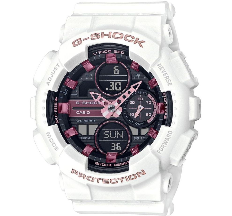 CASIO GMA-S140M-7AER это часы с перспективой и гибким дизайном. Если вы активная, уверенная, и сильная - присмотритесь к данной модели. Может именно ее вы искали всё это время? Ударопрочная конструкция и повышенная устойчивость к вибрациям, делают эту модель по-настоящему выносливой, при любых условиях. Дизайн прекрасно сочетает в себе черный, белый, и розовый цвета. Светодиодная подсветка имеет функцию автоматического включения, идеальный выбор если вам надо следить за временем когда руки заняты. Прочное минеральное стекло защищает ЖК дисплей. Корпус из полимерного пластика довольно прочный и легкий, и переносит более легко перепады в температуры в окружении. Ремешок из полимерного пластика идеальный, поскольку он прочный, гибкий, и легкий. Водостойкость в 200 м. позволит купаться и нырять без акваланга, не повредив при этом часы. Набор функций порадует любого активного человека: