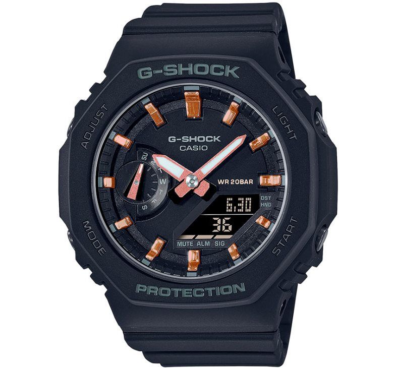 В CASIO GMA-S2100-1AER нет не одной лишней детали. Модель обладает тонким и аккуратным корпусом, качественными материалами, и очень удачной цветовой гаммой - черный корпус, браслет, и циферблат, метки и стрелки цвета розовое золото, и серыми надписями. Аккуратный и уравновешенный дизайн делают эту модель часов идеальной как для парней, так и для девушек. Корпус часов усиленный углеродными волокнами, что несомненно прибавляет устойчивости от различных стрессовых ситуаций - дополнительная защита от сильных ударов и резких перепад температуры. Специальная ударопрочная конструкция это надежная защита от ударов и вибрации. Ремешок из полимерного материала гибкий и прочный, прослужит долго сохраняя превосходный внешний вид. Минеральное стекло защищает циферблат от повреждений, и имеет хорошую стойкость к царапинам. Дисплей освещается светодиодной подсветкой, но также на стрелках нанесено специальное светящееся покрытие. Присутствует такой набор функций: Мировое время; секундомер с пределами измерения от 1/100 сек до 24 часа; таймер с пределами измерения от 1/1 сек до 24 часа; 5 ежедневных будильников; функция перемещения стрелок для легкого доступа к ЖК дисплею; вкл/выкл звука кнопок; полностью автоматический календарь и двойной формат отображения времени.