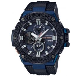 G-SHOK SERIES Противоударные, спортивные, многофункциональные часы. Отлично послужат модным и стильным аксессуаром для современного человека. Легко вписываются в современный городской стиль. По Bluetooth можно подключить часы к смартфону, получить доступ к целому ряду полезных функций и настроек, через приложение G-Shock Connected. Функция поиска телефона, настройка и управление функционалом. Стальной корпус с полимерной ударопрочной структурой. На него прикручен шестью винтами карбоновый безель. Полимерный удобный, пластичный, приятный ремешок. Застежка и задняя крышка из нержавеющей стали. Имеют невероятную водонепроницаемость до 200 метров.  В корпус утоплены четыре кнопки для управления, настройки и подсветки. Прочное минеральное стекло надежно защищает часы от повреждений. Стрелки в форме мечей с люминесцентным покрытием. Два дополнительных дисплея показывают, дни недели либо включенные функции такие как секундомер, таймер и будильник, второй дисплей показывает мировое время. Есть апертура даты. Подсветка светодиодная. В них установлена солнечная батарея, заряжаются от любого источника света. Размер 58 мм на 53 мм, толщина 14 мм. Оснащены вечным календарем. Часы можно заказать с другим ремешком и расцветкой циферблата. Для этого в строке поиска нужно ввести название модели без окончания, GST-B100