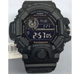 G-SHOCK RANGEMAN SERIES Противоударные, многофункциональные часы. Отличный аксессуар и шикарный подарок всем любителям экстремальных видов спорта и отдыха. Олицетворяют сочетания функций, необходимость в которых может возникнуть в различных экстремальных и нестандартных ситуациях, так и ежедневных, которыми пользуются регулярно. Прием радиосигнала из Европы, помогает после настройки время на местный часовой пояс, получать радиосигнал калибровки, гарантирующий, что они будут всегда показывать точное время. Зарядка накопительного аккумулятора происходит от солнечных лучей или любого источника света, аккумулятор не требует замены. Корпус и ремешок полимерный, с повышенной грязезащитной. Циферблат цифровой, защищен ударопрочным минеральным стеклом. Подсветка мощная электролюминесцентная, автоматически активируется при повороте часов на себя или кнопкой. Помимо стандартных функций, таких как, смена часовых поясов, секундомер на 1000 часов, таймера до 24 часов, пяти независимых будильников. Установлен Triple Sensor третьего поколения. Он отвечает за: Барометр от 260 до 1100 hPa, с барометрическим графиком. Альтиметр, высотомер до 10000 метров, со значением метража над уровнем моря с записной книжкой до 40 записей. Термометр от -10°C до +60°C. Данные о восходе и закате солнца. Индикатор низкого уровня заряда аккумулятора. Размер 55 мм на 53 мм, толщина 18 мм. Водонепроницаемость 200 метров.