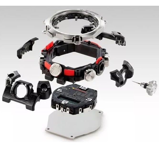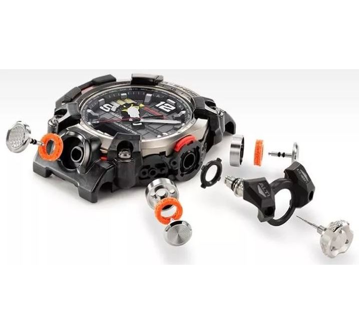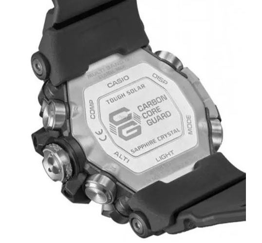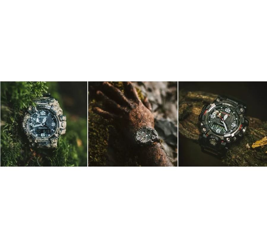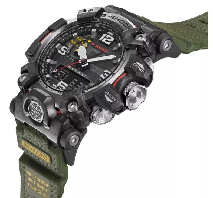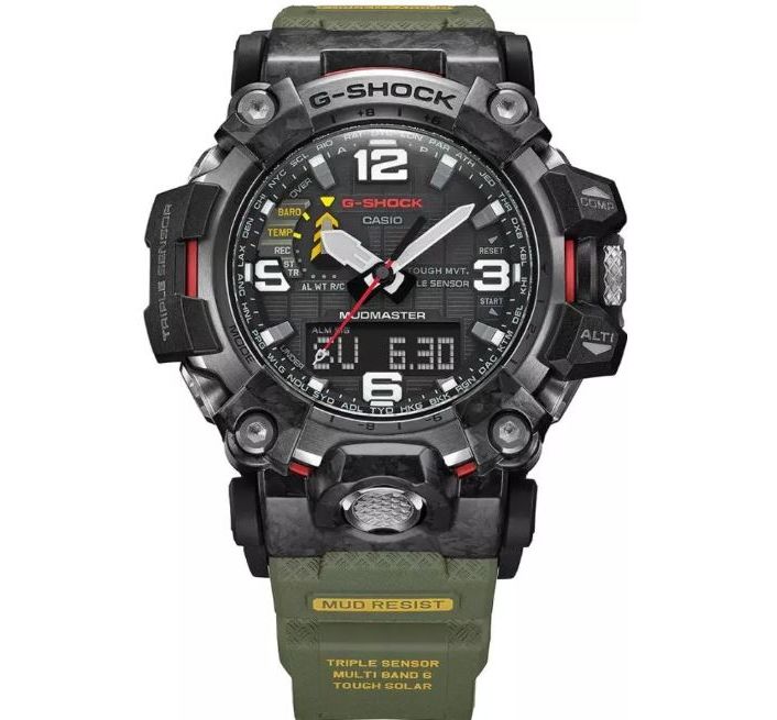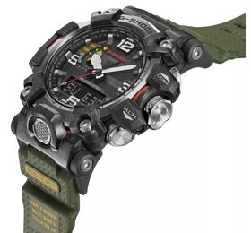 G-SHOCK NEW MUDMASTER Противоударные, многофункциональные часы. Отличный аксессуар и шикарный подарок всем любителям экстремальных видов спорта и отдыха. Олицетворяют сочетания функций, необходимость в которых может возникнуть в различных экстремальных и нестандартных ситуациях, так и ежедневных, которыми пользуются регулярно. Корпус выполнен из многокомпозитных современных материалов, невероятно легкого и очень прочного известного как Carbon Core Guard. Усиленный неилоновыми волокнами в сочетании с карбоном, способен выдержать экстремальную нагрузку и маловоспреимчив к внешним воздействиям. Модуль часов имеет силиконовую прослойку из материала alphaGEL которій амартизирует и защищает часи от сотрясений и вибраций. С повышенной грязезащитой. Стекло сапфир,не царапается, максимально противоударное. Крупные белые стрелки, в форме мечей, с мощным светонакопительным покрытием. Радиосинхронизация, прием радиосигнала из Европы, США, Японии, Китая, помогает после настройки время на местный часовой пояс, получать радиосигнал калибровки, гарантирующий, что они будут всегда показывать точное время. Или перенастраивает при перелетах на текущее время в той точке мира, в которой вы находитесь. Автоматическая смена зимнего и летнего времени. На девяти часах расположено колесо выбора функций, индикатором отмечаются функции которые выбраны на данный момент. Циферблат объемный многослойный с цифровым дисплеем. На нем отображается время в цифровом формате либо число, месяц и день недели на выбор. Нажатием кнопок, на циферблате активируется: Барометр от 260 до 1100 hPa, с барометрическим графиком. Альтиметр, высотомер до 10000 метров и графиком набора высоты, со значением метража над уровнем моря. Термометр от -10°C до +60°C. Данные о восходе и закате солнца. Секундомер на 24 часа. Таймер обратного отсчета до 24 часов. Пять независимых будильников. Функция перемещения стрелок. Автоматический календарь. Заржаются от любого источника света, не требуют заряда аккумулятора. В часах есть автоматическая светодиодная подсветка. Размер 61,2 мм на 54,4 мм, толщина 16,1 мм. Водонепроницаемость 200 метров, до 20 Бар (ISO 2281). Часы можно заказать с другим ремешком и расцветкой циферблата. Для этого в строке поиска нужно ввести название модели без окончания, GWG-2000