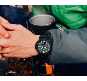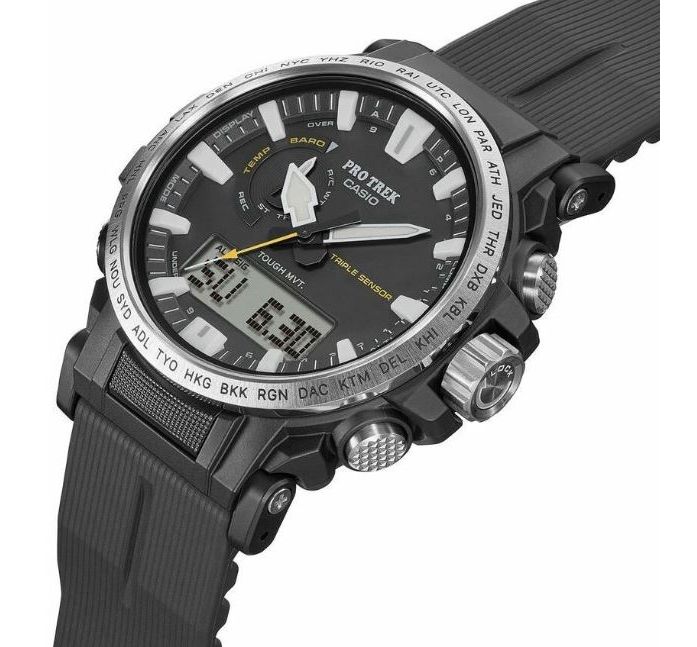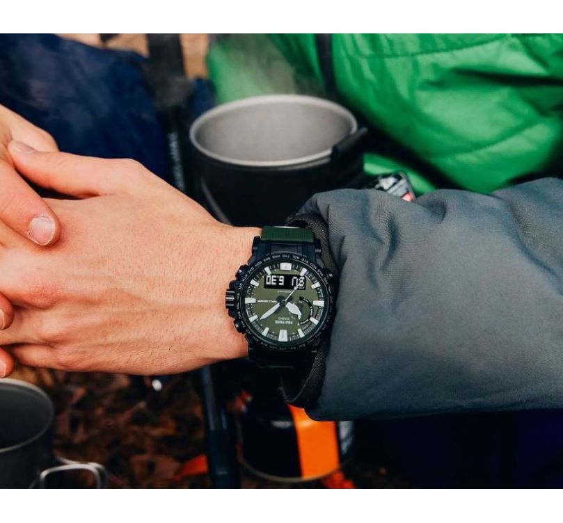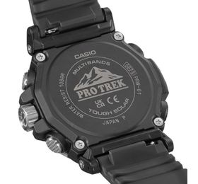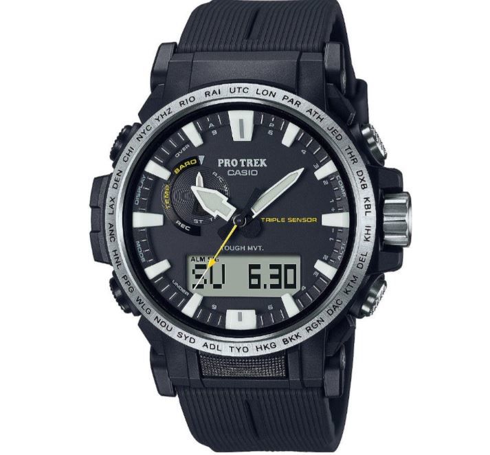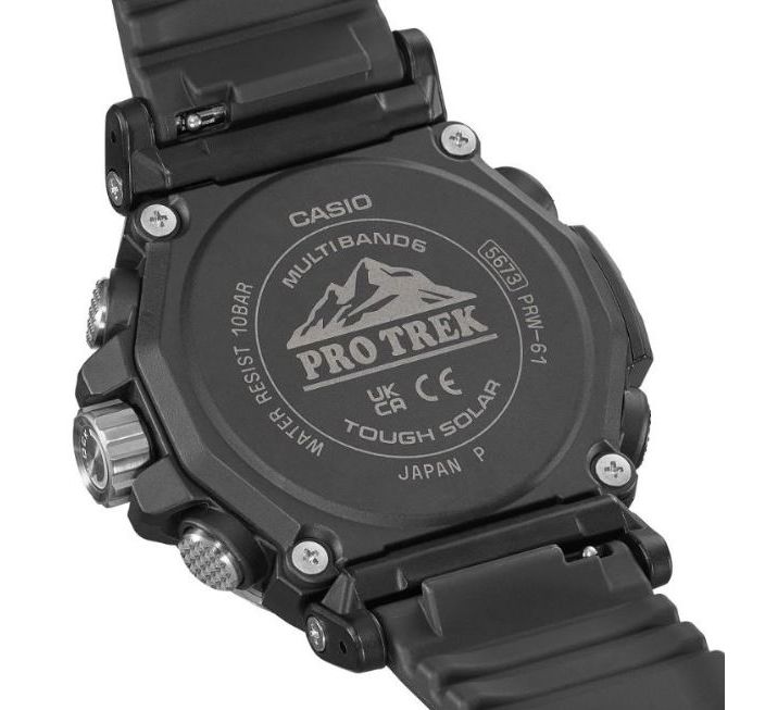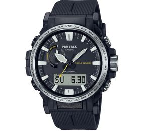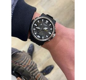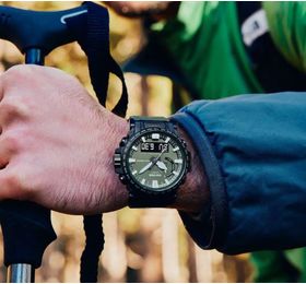 PRO TREK SERIES Многофункциональные, компактные часы. Легко вписываются в современный городской стиль. Олицетворяют сочетания функций, необходимость в которых может возникнуть в различных экстремальных и нестандартных ситуациях, так и ежедневных, которыми пользуются регулярно. Установлена сонечная панель.Элемент питания заряжается от любого источника света. Часы могут работать без подзарядки пять месяцев, в энэргозберегающем режиме девятнадцать месяцев. Ударопрочное минеральное стекло. Корпус полимерный имеет по две кнопки с каждой стороны и одну кнопку подсветки снизу. Также еще есть коронка с правой стороны между кнопками. Безель с износоустойчивым неоновым покрытием. Задняя крышка из нержавеющей стали, имеет новую икс образную конструкцию, где куски стали загибаются и удерживают браслет. Ремешок полимерный. Стрелки в форме мечей с люминесцентным, неопритовым покрытием, нанесенным также и на метки. Что позволяет точно определять время в любых условиях. Подсветка светодиодная. Имеют технологию зарядки солнечной батареи. Оснащены функцией радиоконтроля. Прием радиосигнала из Европы, помогает после настройки время на местный часовой пояс, получать радиосигнал калибровки, гарантирующий, что они будут всегда показывать точное время. На десяти часах расположено колесо выбора функций, индикатором отмечаются функции которые выбраны на данный момент. Помимо стандартных функций, таких как, смена часовых поясов, секундомер, таймера, пяти независимых будильников. Установлен Triple Sensor третьего поколения. Он отвечает за: Барометр , с барометрическим графиком. Альтиметр, высотомер, со значением метража над уровнем моря с записной книжкой. Термометр от -10°C до +60°C. Устойчивы к работе на низкой температуре, -10 не влияет на работу часов и функций. Водонепроницаемость 100 метров. Водонепроницаемость 100 метров. Часы можно заказать с другим ремешком и расцветкой циферблата. Для этого в строке поиска нужно ввести название модели без окончания, PRW-61