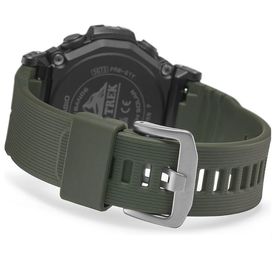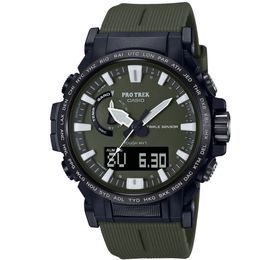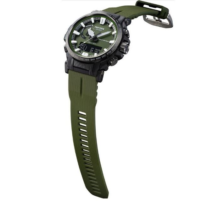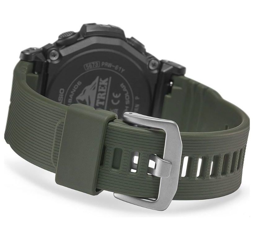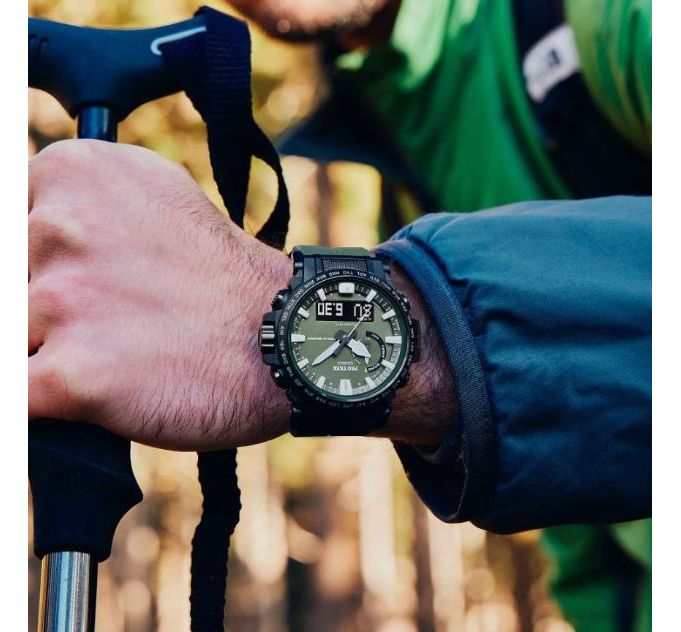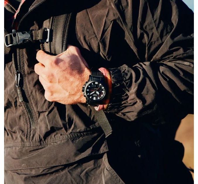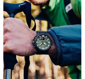 PRO TREK SERIES Многофункциональные, компактные часы. Значительно уменьшились в своих габаритах. Легко вписываются в современный городской стиль. Олицетворяют сочетания функций, необходимость в которых может возникнуть в различных экстремальных и нестандартных ситуациях, так и ежедневных, которыми пользуются регулярно. Ударопрочное минеральное стекло. Корпус полимерный имеет по две кнопки с каждой стороны и одну кнопку подсветки снизу. Также еще есть коронка с правой стороны между кнопками. Безель с износоустойчивым неоновым покрытием. Задняя крышка из нержавеющей стали, Ремешок полимерный. Стрелки в форме мечей с люминесцентным, неопритовым покрытием, нанесенным также и на метки. Что позволяет точно определять время в любых условиях. Подсветка светодиодная. Заряжаются от любого источника света. Оснащены функцией радиоконтроля. Прием радиосигнала из Европы для калибровки точности. На десяти часах расположено колесо выбора функций, индикатором отмечаются функции которые выбраны на данный момент. Помимо стандартных функций, таких как, смена часовых поясов, секундомер на 1000 часов, таймера до 1 часа, пяти независимых будильников. Установлен Triple Sensor третьего поколения. Он отвечает за: Барометр от 260 до 1100 hPa, с барометрическим графиком. Альтиметр, высотомер до 10000 метров, со значением метража над уровнем моря с записной книжкой. Термометр от -10°C до +60°C. Устойчивы к работе на низкой температуре, -10 не влияет на работу часов и функций. Водонепроницаемость 100 метров.