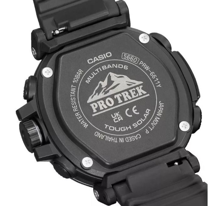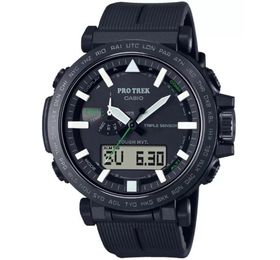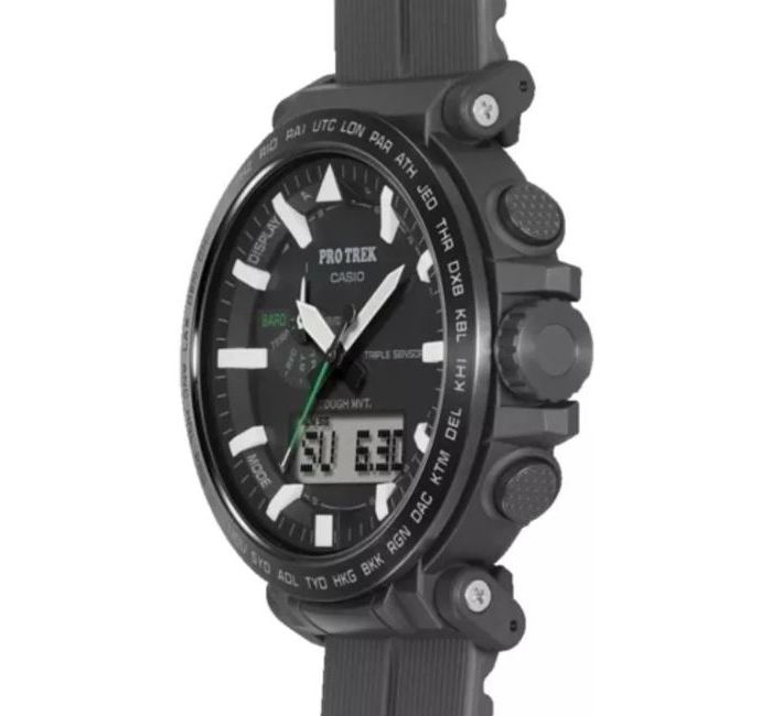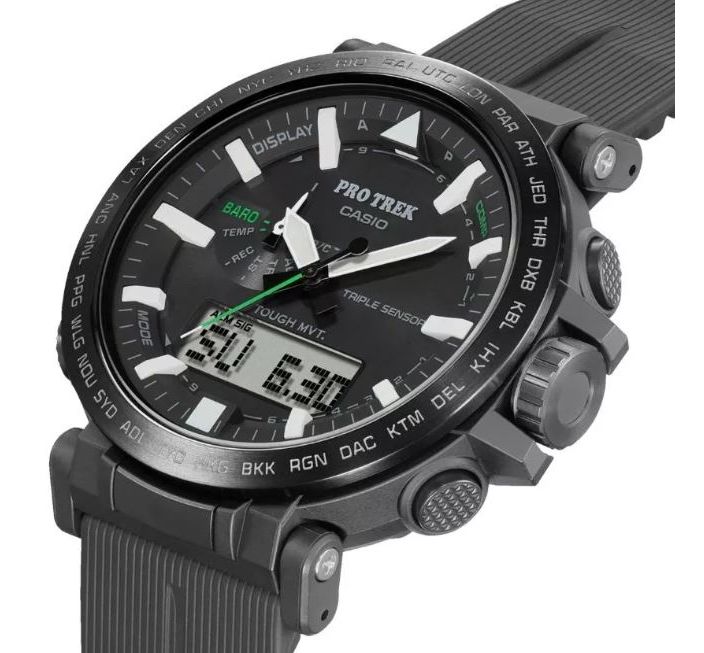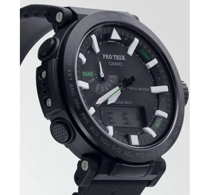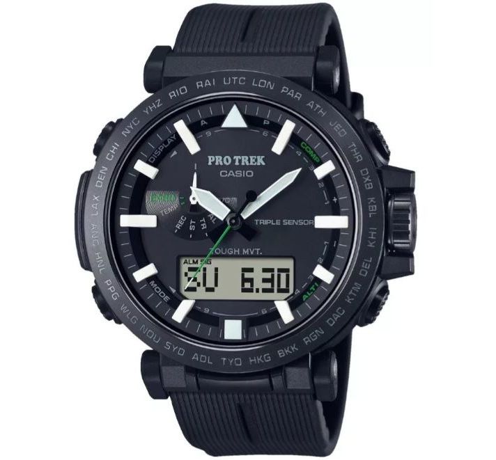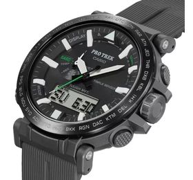 PRO TREK SERIES Многофункциональные, компактные часы. Легко вписываются в современный городской стиль. Олицетворяют сочетания функций, необходимость в которых может возникнуть в различных экстремальных и нестандартных ситуациях, так и ежедневных, которыми пользуются регулярно. Установлена сонечная панель.Элемент питания заряжается от любого источника света. Часы могут работать без подзарядки пять месяцев, в энэргозберегающем режиме девятнадцать месяцев. Ударопрочное минеральное стекло. Корпус полимерный имеет по две кнопки с каждой стороны и одну кнопку подсветки снизу. Также еще есть коронка с правой стороны между кнопками. Безель с износоустойчивым неоновым покрытием. Задняя крышка из нержавеющей стали, имеет новую икс образную конструкцию, где куски стали загибаются и удерживают браслет.Ремешок полимерный. Стрелки в форме мечей с люминесцентным, неопритовым покрытием, нанесенным также и на цифры. Что позволяет точно определять время в любых условиях. Подсветка светодиодная. Имеют технологию зарядки солнечной батареи. Оснащены функцией радиоконтроля. Прием радиосигнала из Европы, помогает после настройки время на местный часовой пояс, получать радиосигнал калибровки, гарантирующий, что они будут всегда показывать точное время. На десяти часах расположено колесо выбора функций, индикатором отмечаются функции которые выбраны на данный момент. Помимо стандартных функций, таких как, смена часовых поясов, секундомер , таймера , пяти независимых будильников. Установлен Triple Sensor третьего поколения. Он отвечает за: Барометр , с барометрическим графиком. Альтиметр, высотомер, со значением метража над уровнем моря с записной книжкой. Термометр от -10°C до +60°C. Устойчивы к работе на низкой температуре, -10 не влияет на работу часов и функций. Водонепроницаемость 100 метров. Водонепроницаемость 100 метров. Часы можно заказать с другим ремешком и расцветкой циферблата. Для этого в строке поиска нужно ввести название модели без окончания, PRW-6621