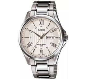 CASIO COLLECTION Классические, тонкие, аккуратные часы. Приятный цвет циферблата. Противоударное минеральное стекло. Браслет из нержавеющей стали. Коронка настраивает в первом положении дату, вторую дату и день недели. Водонепроницаемость 100 метров. Часы можно заказать с другим ремешком и окраской циферблата. Для этого в строке поиска нужно ввести название модели без окончания, MTP-1384D