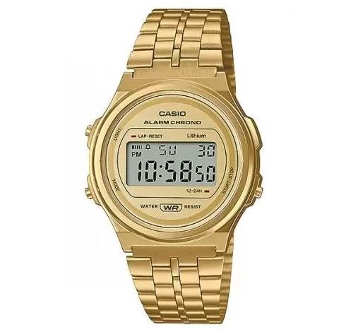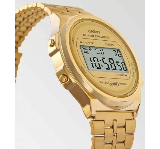 CASIO A171WEG-9AEF Vintsge. Стильный, эпотажный дизайн этой модели, не оставит равнодушным никого. Очень компактные, диаметр по ширине всего 38мм, а вес 45г, что делает их практически невесомыми. Плавающая застежка. Подсветка. Помимо электронного отображения времени, даты и дня недели также есть будильник и секундомер. Батарейки должно хватить на 7 лет. Часы выдерживают мытье рук, дождь. Часы можно заказать в другом цвете. Для этого в строке поиска нужно ввести название без окончания, A171