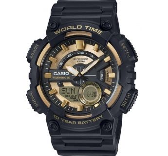 Часы CASIO AEQ-110BW-9AVDF с красиво оформленным золотистым циферблатом. Они имеют кварцевый механизм с минимальным энергопотреблением, что позволит часам работать на одной батарейке до 10 лет, несмотря на расширенный функционал калибра. Конструкция выполнена из черного полимера. Он прост в эксплуатации, хорошо противостоит невзгодам эксплуатации и легко чистится. Стрелки и метки крупные, это позволит считывать показания в любых условиях. Водозащита позволит купаться в часах и погружаться с маской.