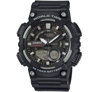 Часы CASIO AEQ-110W-1AVEF с красиво оформленным темным циферблатом. Они имеют кварцевый механизм с минимальным энергопотреблением, что позволит часам работать на одной батарейке до 10 лет, несмотря на расширенный функционал калибра. Конструкция выполнена из черного полимера. Он прост в эксплуатации, хорошо противостоит невзгодам эксплуатации и легко чистится. Стрелки и метки крупные, это позволит считывать показания в любых условиях. Водозащита позволит купаться в часах и погружаться с маской.