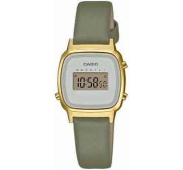Casio Women’s Vintage Mini Отличный подарок всем любительницам компактных женских часов. Элегантные, пользующиеся огромной популярностью во всем Мире. Так полюбившиеся своим утонченным внешним видом, практичностью и надежностью. Золотистые часы со светлым циферблатом в форме подушки и цифровым дисплеем. Корпус изготовлен из полимера с износоустойчивым покрытием. Ремешок из натуральной кожи. Застежка классическая пряжка. Стекло из акрила, в силу своей эластичности оно устойчиво к ударам. По бокам три кнопки для настройки и управления функциями. Подсветки нет. Есть вечный календарь, после настройки всегда отображает точную дату. Будильник. Секундомер до 1-го часа. Таймер до 30 минут. Батарейки хватает от 2 до 5 лет. Механизм надежный, японский. Гарантия 2 года. Часы можно заказать с другим ремешком и расцветкой циферблата. Для этого в строке поиска нужно ввести название модели без окончания, LA670