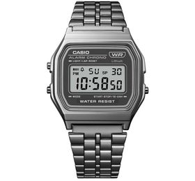 Наш любимы дизайн часов CASIO A158WETB-1AEF нельзя перепутать не с чем. Это дань старым винтажным моделям, но с добавлением новых инновационных идей. Особое внимание стоит уделить IP специальному покрытию который обладает просто фантастическим цветом и высокой устойчивостью к царапинам и потертостям. Квадратный корпус создан из прочного полимерного пластика, довольно неприхотливый материал для ежедневного использования. Элегантный браслет из нержавеющей стали создает отличный тандем с корпусом благодаря однотонному покрытию. Браслет оснащен удобной регулируемой застежкой что позволит вам самостоятельно выставлять нужную вам длину. Акриловое стекло стойкое к ударам и давлению. Светодиодная подсветка обеспечит комфортное считывание данных в темное время суток. Работу часов обеспечивает батарейка с продолжительным сроком службы, около 7 лет. Водонепроницаемость минимальная, следует избегать контакты с обильным количеством воды. Присутствует функция секундомера, один ежедневный будильник, полностью автоматический календарь и отображение времени в выбранным вами удобном 12-часовом или 24-часовом формате.
