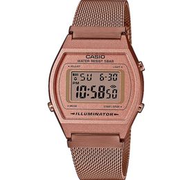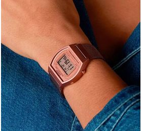 Нежные и аккуратные часы CASIO B640WMR-5AEF отдают дань винтажным моделям, но всё же призваны показать себя в обновленной форме. Хоть квадратные формы и выглядят нам более знакомыми, но закругленная бочковидная форма придает часам особую элегантность и характер. Они выглядят одновременно знакомыми и новыми. И такое может быть:) Специальное IP Finish покрытие цвета розовое золото выглядит элегантно и надежно, по сколько такое покрытие обладает повышенной устойчивостью к царапинам и потертостям. Корпус создан из прочного полимерного материала, что идеально подходит для использования на каждый день, по сколько этот материл устойчив к окружающим воздействиям таких как холод или жара. Акриловое стекло очень устойчивое к ударам и давлению. Металлический миланский браслет гибкий и прочный, такой тип браслета один из самых востребованных на этот момент. Специальная застежка на браслете легко регулируется, это комфортно и не требует особых усилий. Дисплей освещается специальным светодиодом. Функции: секундомер с пределами измерения времени до 24 часа; таймер обратного отсчета с автоматическим повтором установленного времени, пределы установки от 1 сек до 24 часа; один многофункциональный будильник с 4 вариациями настройки; календарь который после настройки будет всегда показывать точное число; возможность отображения времени на выбор, в 12-часовом или 24-часовом формате. Водонепроницаемость в 5 бар позволяет принимать душ или ванную не снимая часы, но не более.