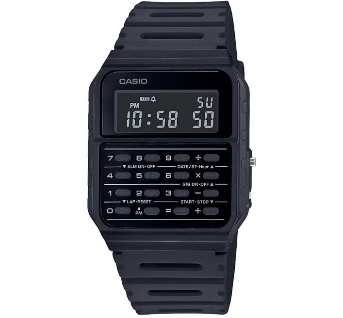 Часы CASIO CA-53WF-1BEF безусловно стильный аксессуар что окунет вас в мгновения прошлого - и это всё благодаря удачному цветовому решению, и восьми разрядному калькулятору что позволяет производить математические вычисления содержащие до 8 знаков. Данная модель Casio идеально подойдет для людей которые "живут на два часовых поясов" - одновременное отображение актуального времени в двух часовых поясах. Секундомер измеряет прошедшее время до 24 часа, с точностью в 1/100 сек. Один ежедневный будильник. Вечный календарь после настройки будет всегда показывать точное число. Отображение времени в удобном вам 12-часовом или 24-часовом формате. Корпус и ремешок сделаны из прочного полимерного материала, а стекло акриловое — устойчивое к ударам и давлению. При правильной эксплуатаций часов, приблизительный срок службы элемента питания составляет 5 лет. Модуль 3208. Точность хода +/-15 сек в месяц. Водостойкость у данной модели минимальная (WR), допускаются (но не советуется) кратковременные контакты с водой.